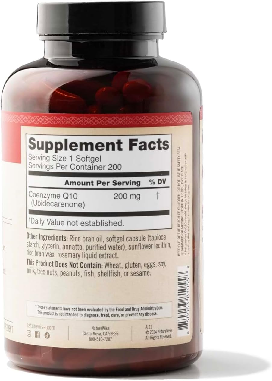VEGAN, NON-GMO, GLUTEN-FREE: NatureWise CoQ10 200mg Softgels are vegan, gluten-free, non-GMO, and do not contain wheat, eggs, soy, milk, tree nuts, peanuts, fish, shellfish, or sesame.