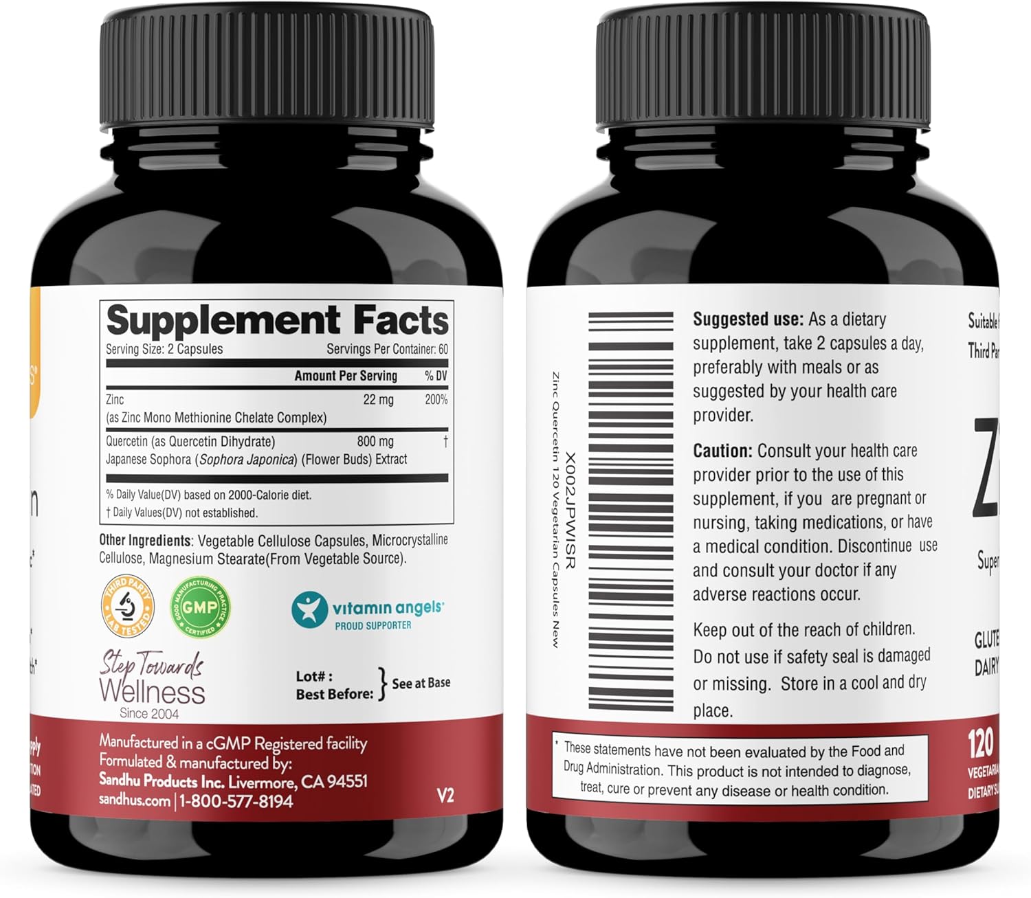 Zinc Quercetin Supplement – Sandhu’s Zinc Quercetin is Manufactured with Globally Sourced Ingredients, packed, tested and distributed in the USA according to strict cGMP norms; Each capsule offers 22mg of Zinc & 800mg of quercetin